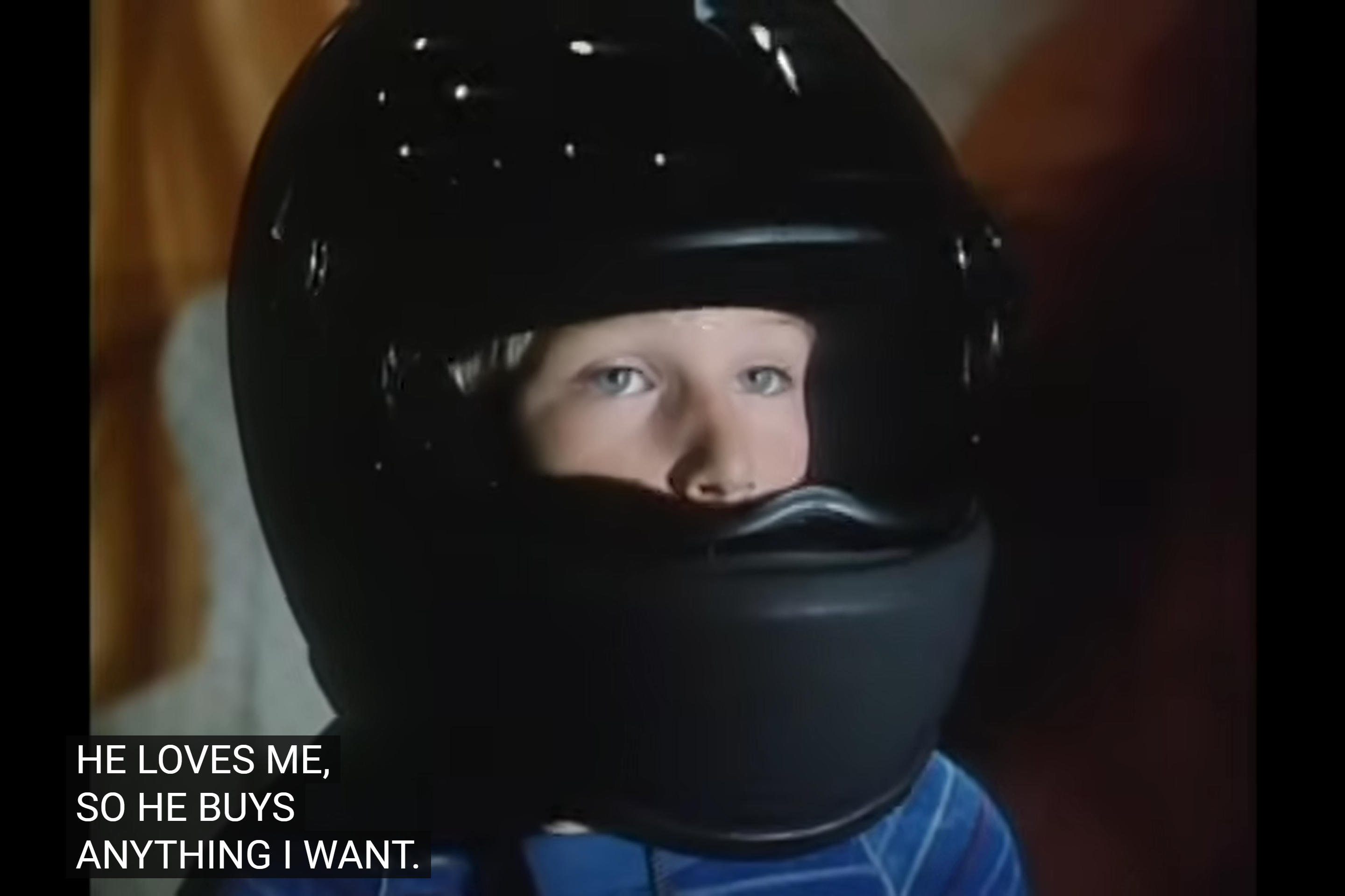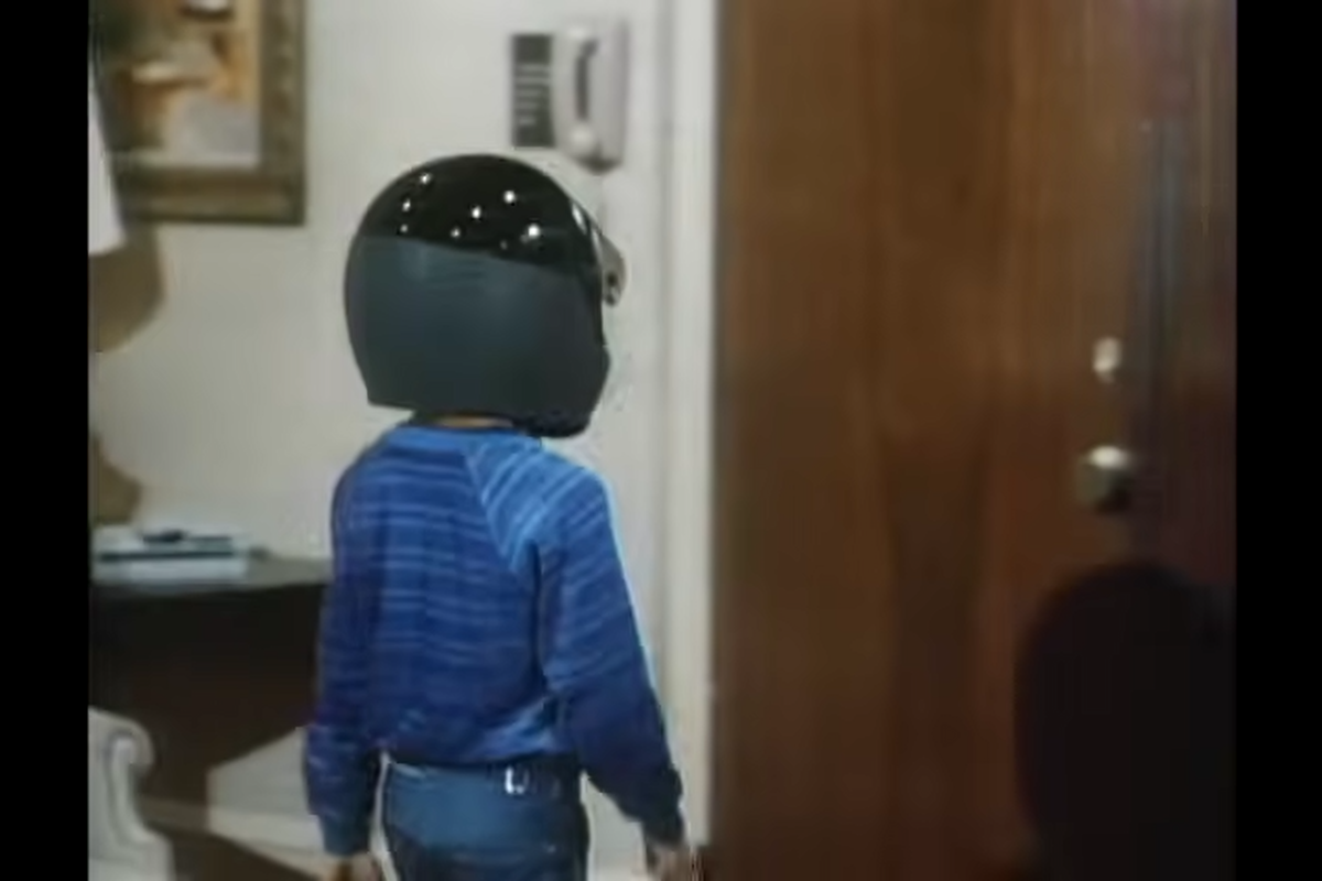 Now, after soaking him again, Jonathan tells Mark that he needs to confront the kid, so Mark enters the room where the boy is staying. And the kid receives him with a black helmet. Just because.