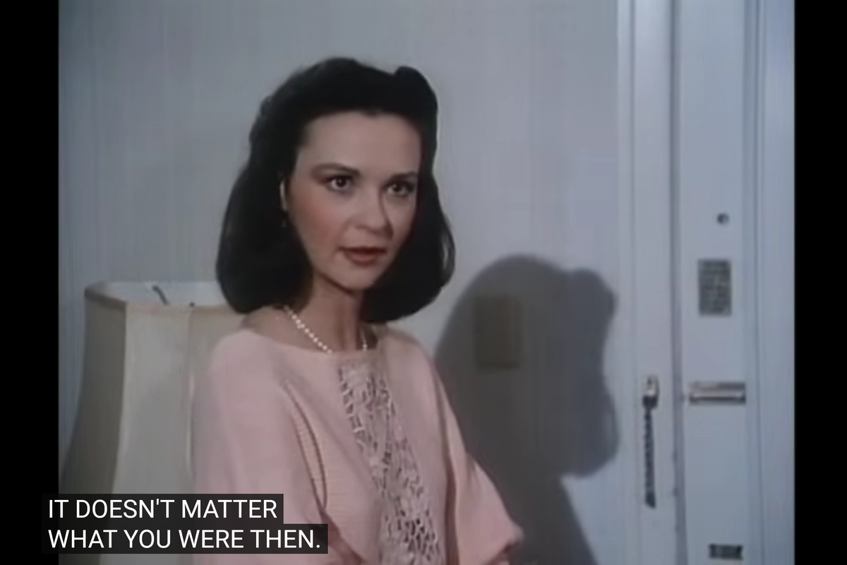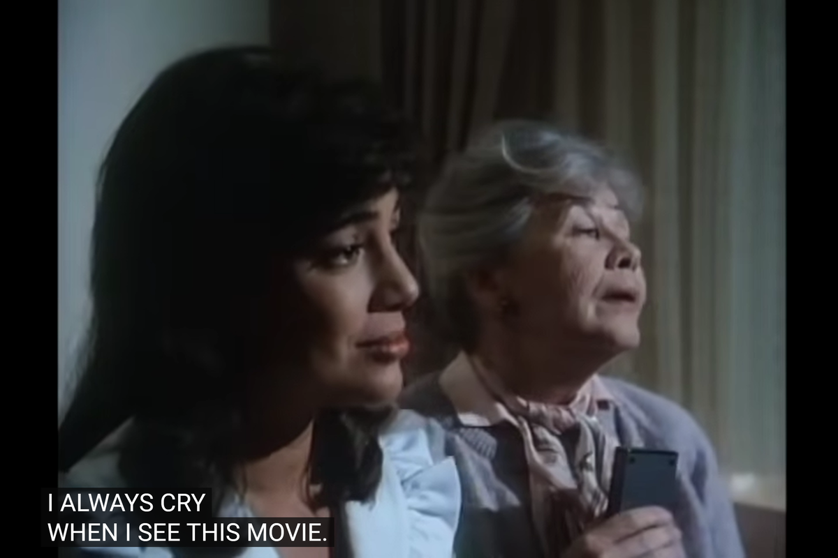 Back at the hotel, Helen, an older actress, is watching one of her old movies on TV with Elena, a younger woman, possibly her granddaughter.