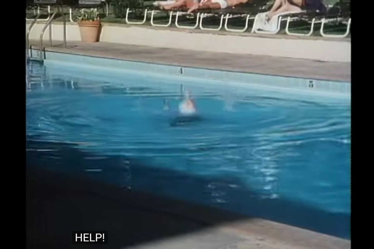 And the kid is standing at the edge of the pool, laughing at him.