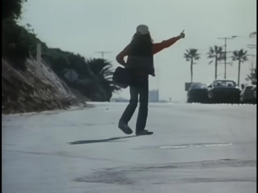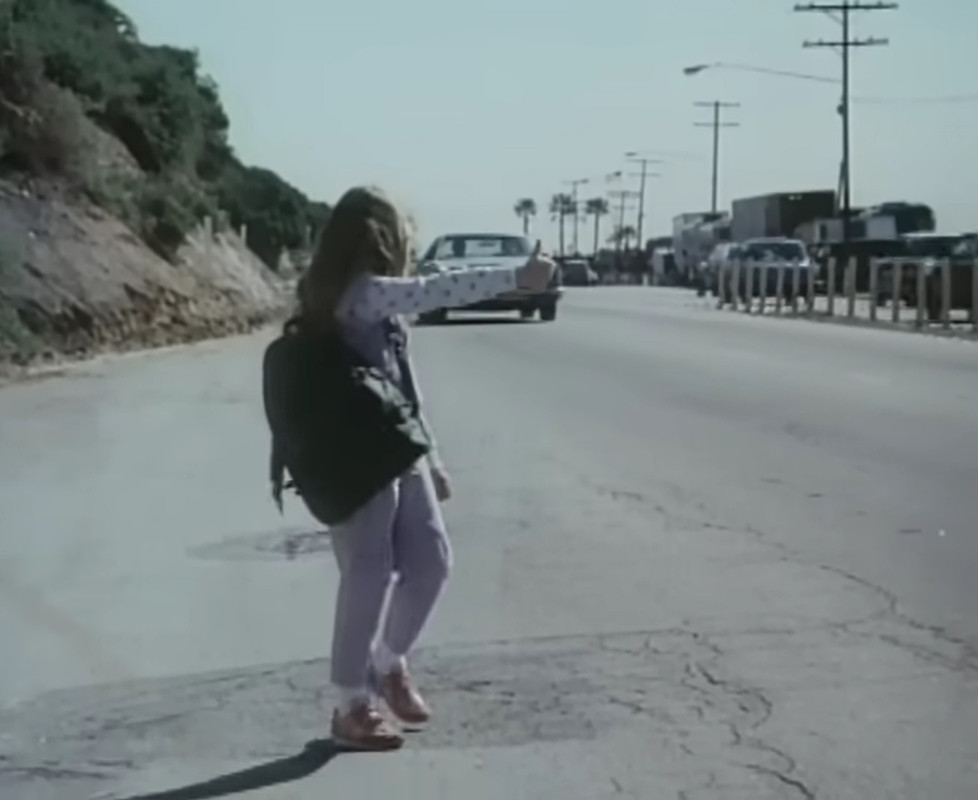 A girl is seen hitchhiking at Porto Marina Way, Los Angeles, mysteriously calm and with only few cars that day (likely they closed part of the highway for the production of this episode).