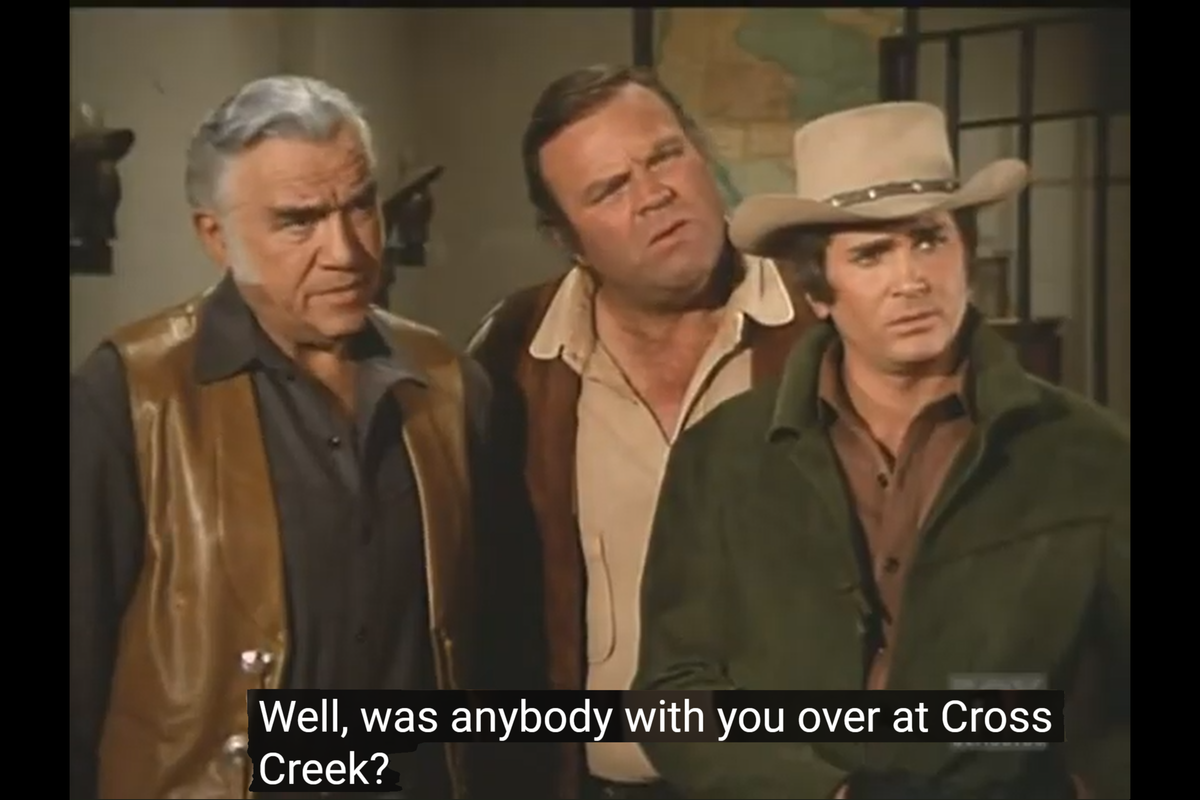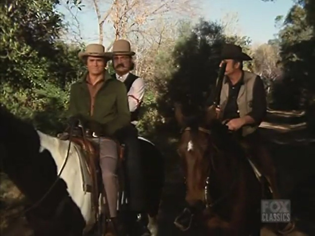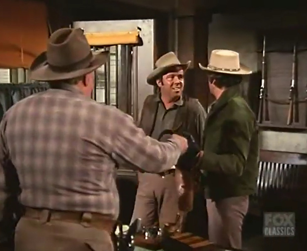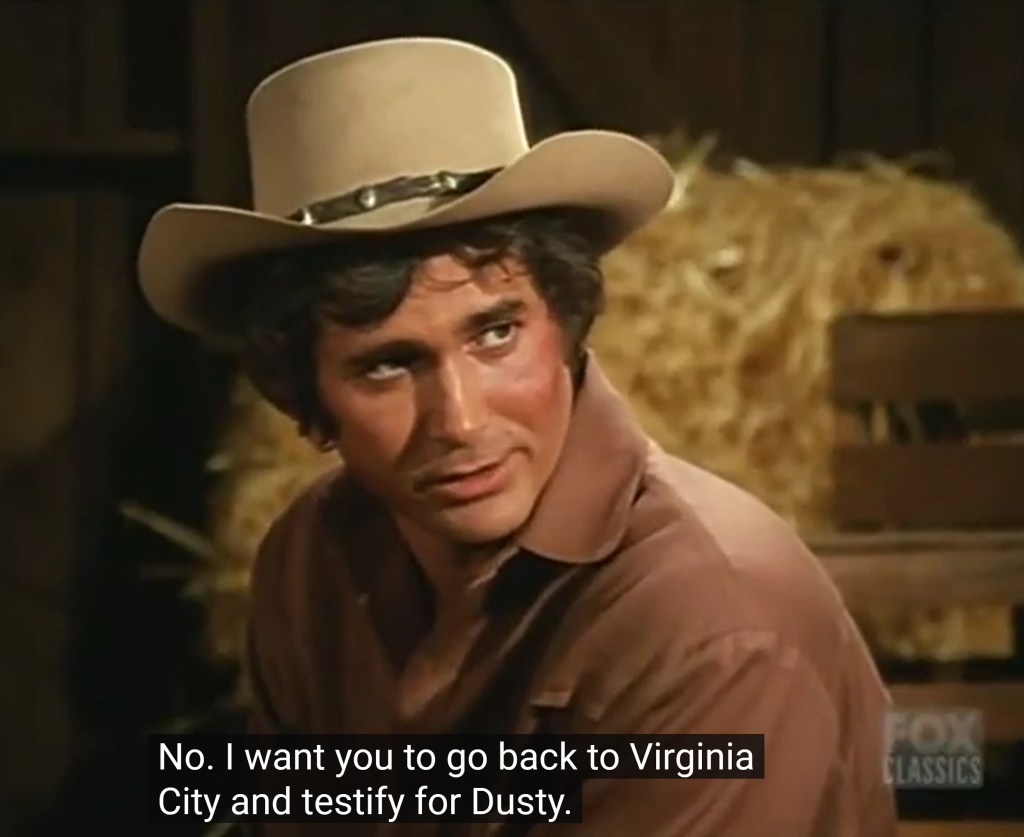 So, apparently the cowboy falsely reported Dusty to the police, accusing him of stealing the money. Dusty is then visited by Landon (here, Joe Cartwright) alongside the other protagonists, Ben and Hoss (Ben is the father, Hoss and Joe his sons) — all Dusty’s friends who want to help him out of this situation.