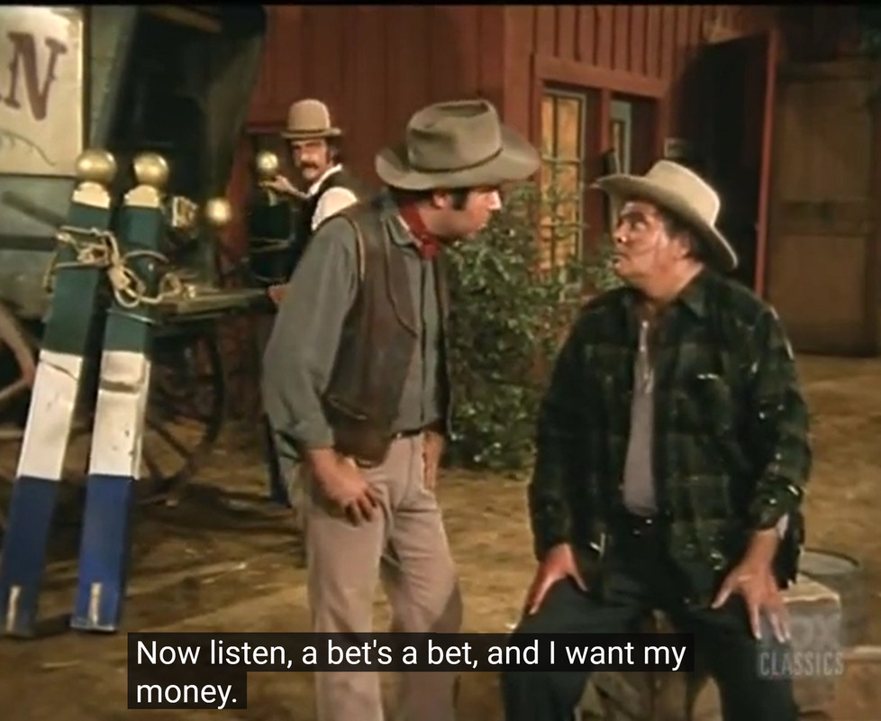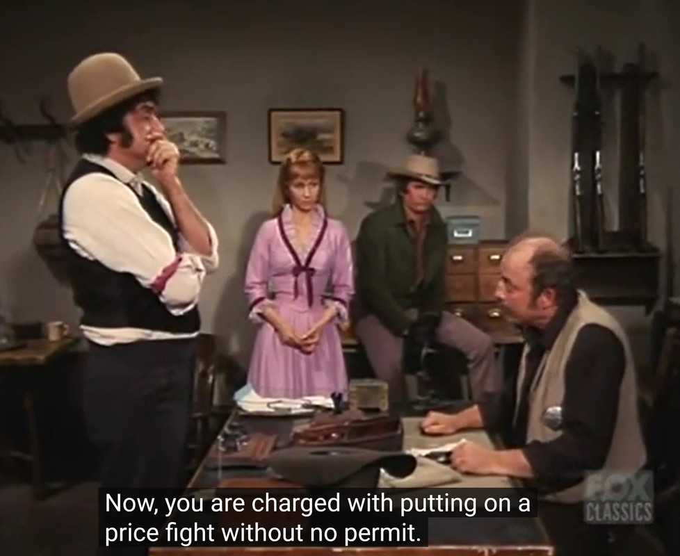 This comedic trope of showing a character really confident saying like: “No one can do anything to me” and later seeing him in jail was pretty common in Bonanza.