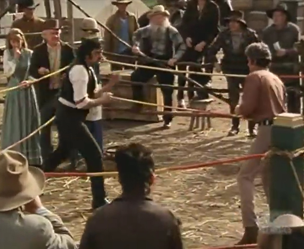 They start wrestling but are interrupted by the sheriff—you know classic Western figure tasked with keeping order (and who doesn’t exist on Little House)—who declares the event illegal.