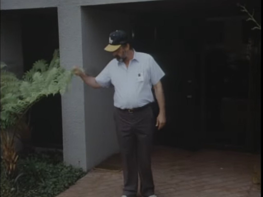 And he even checks under a plant.