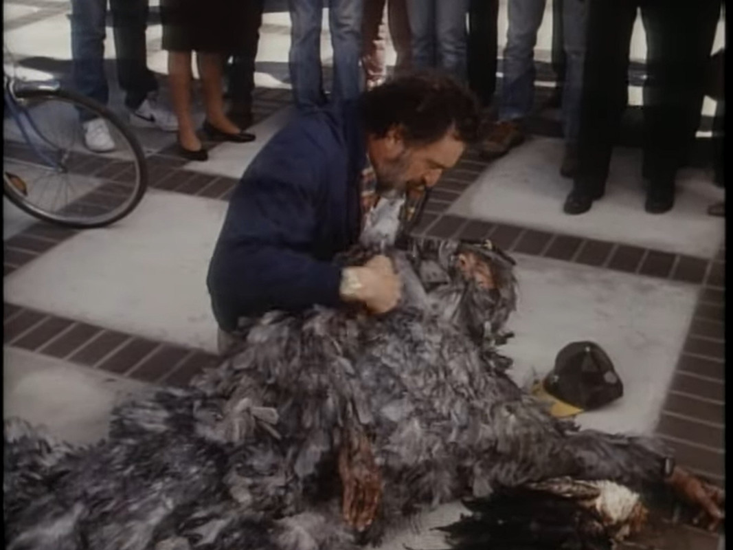 Anyway, Jonathan’s “assignment” is to investigate the mysterious death of some seagulls that he’s convinced stems from a Plant nearby polluting the water. And his investigation apparently involves organizing demonstration where he drops some punchlines dressed up in a weird bird costume.