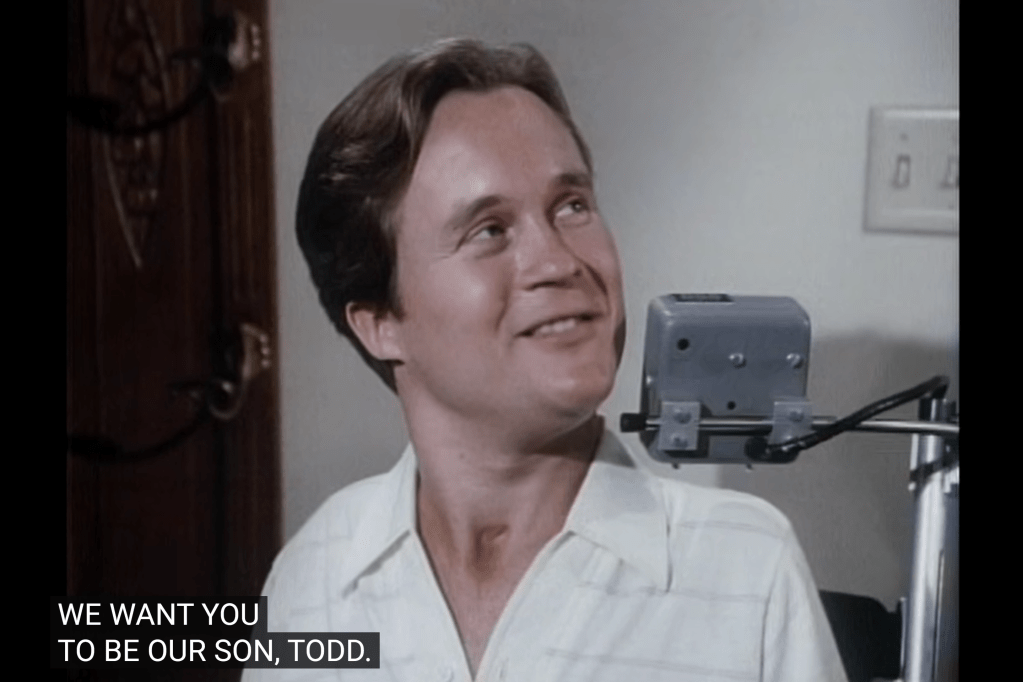 Eventually, they are convinced to adopt a baby, until Jonathan matches them with Todd, a mentally impaired kid who mistakenly believes Scotty and Diane want to adopt him.