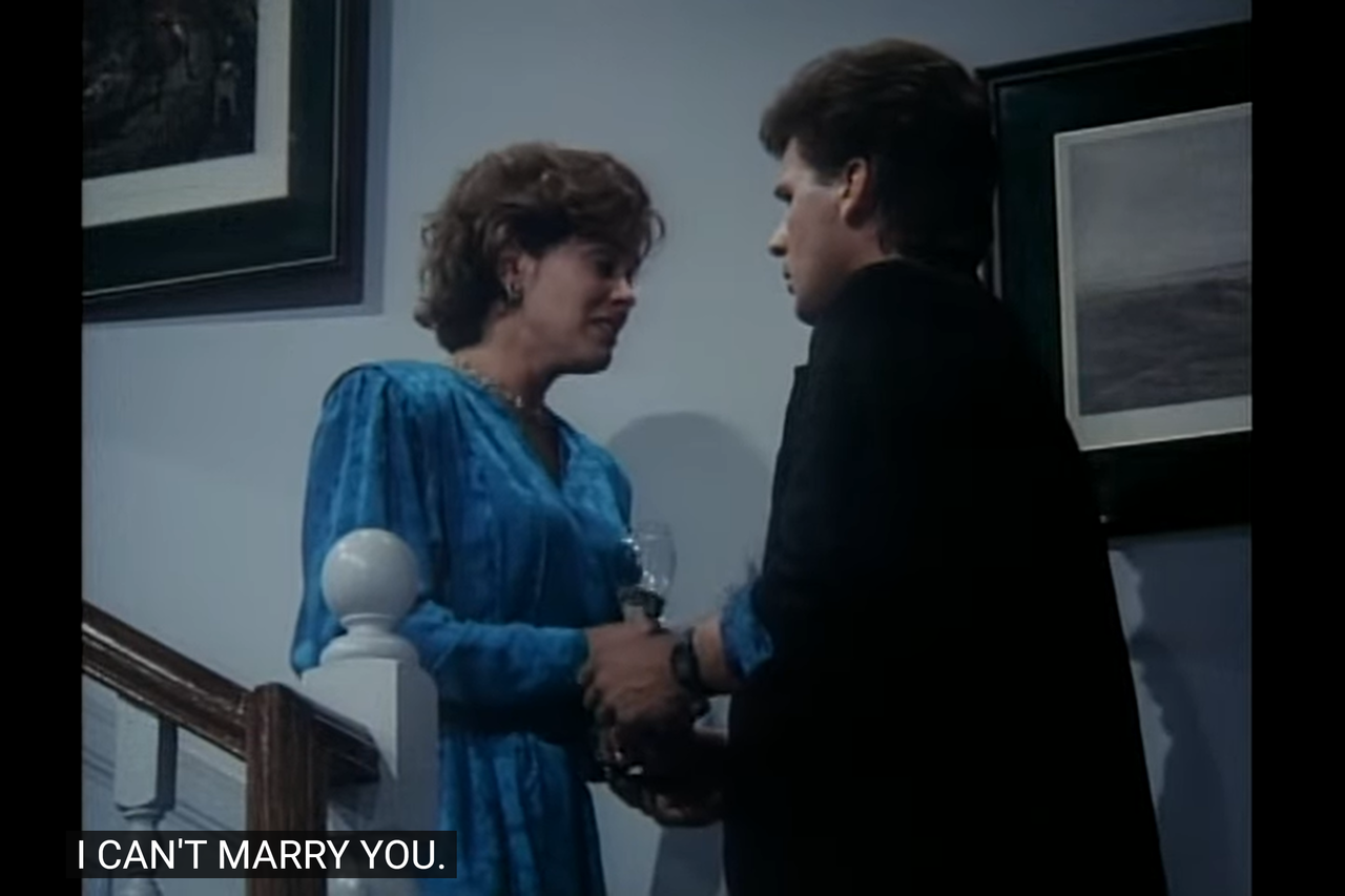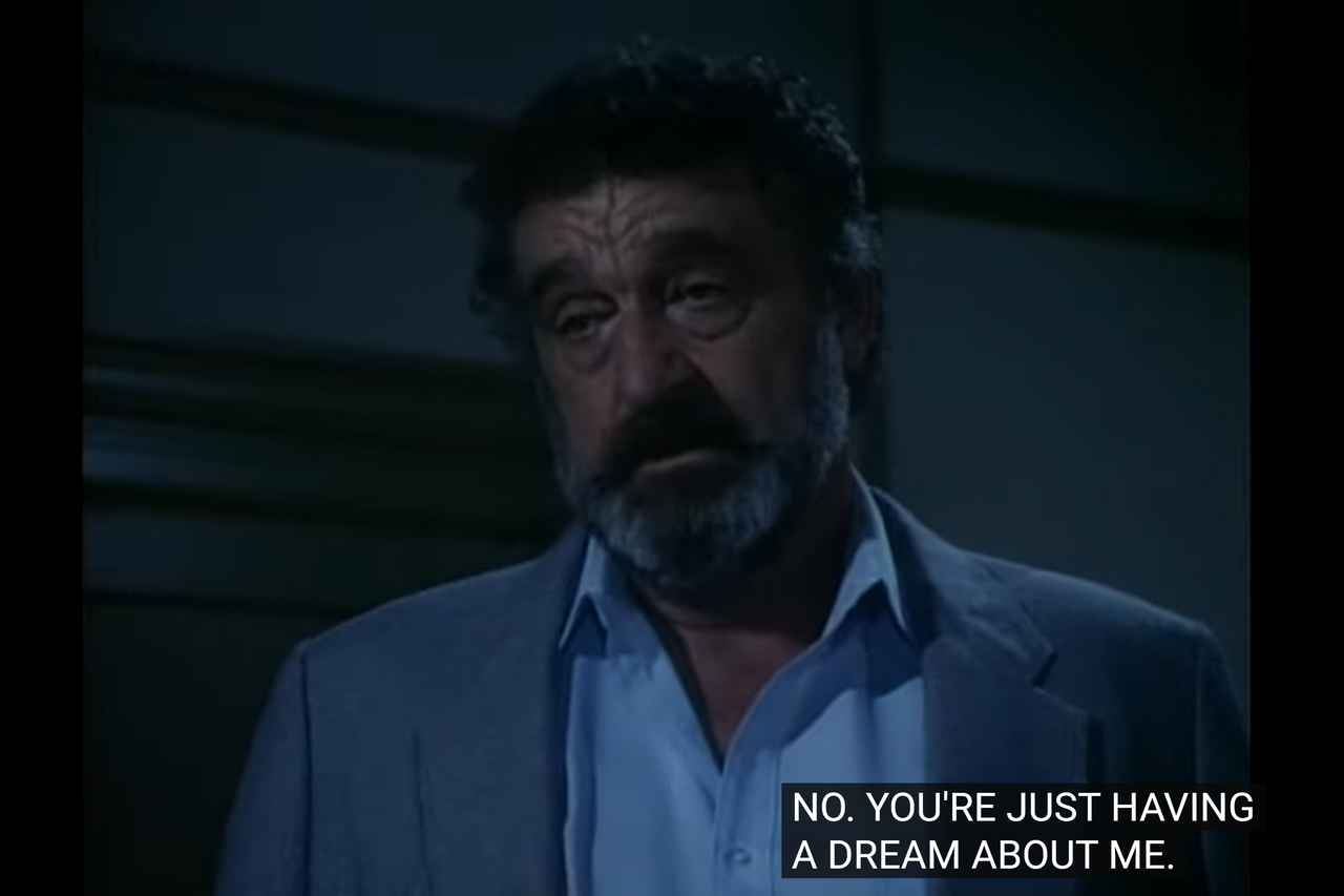 Instead, as for the setting, it’s problematic too, in the way it connects to the prologue: at the conclusion of that cold open, Mark told Jonathan they had to leave right away, implying the wedding was somewhere far. However, in this episode, they show that the exterior of the motel Jonathan and Mark are staying at is the same motel as they were in the prologue (which was a recycle from Change Of Life, for that matter).