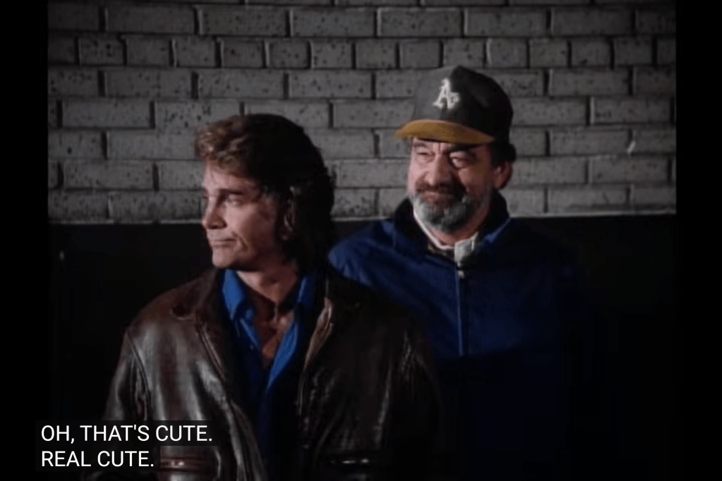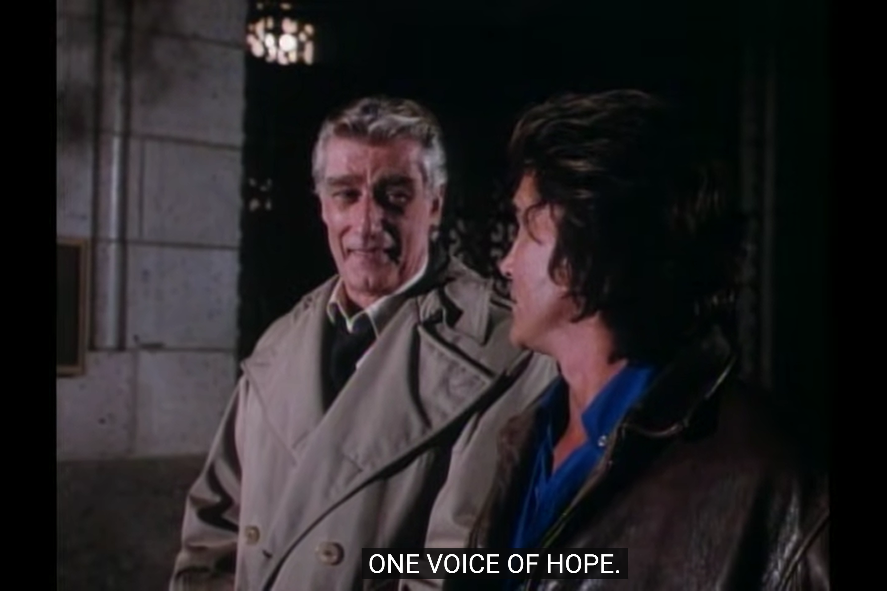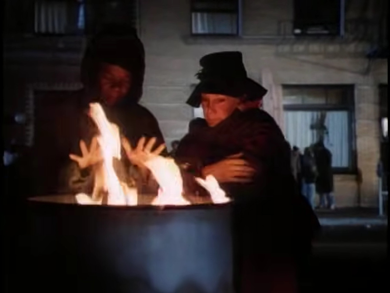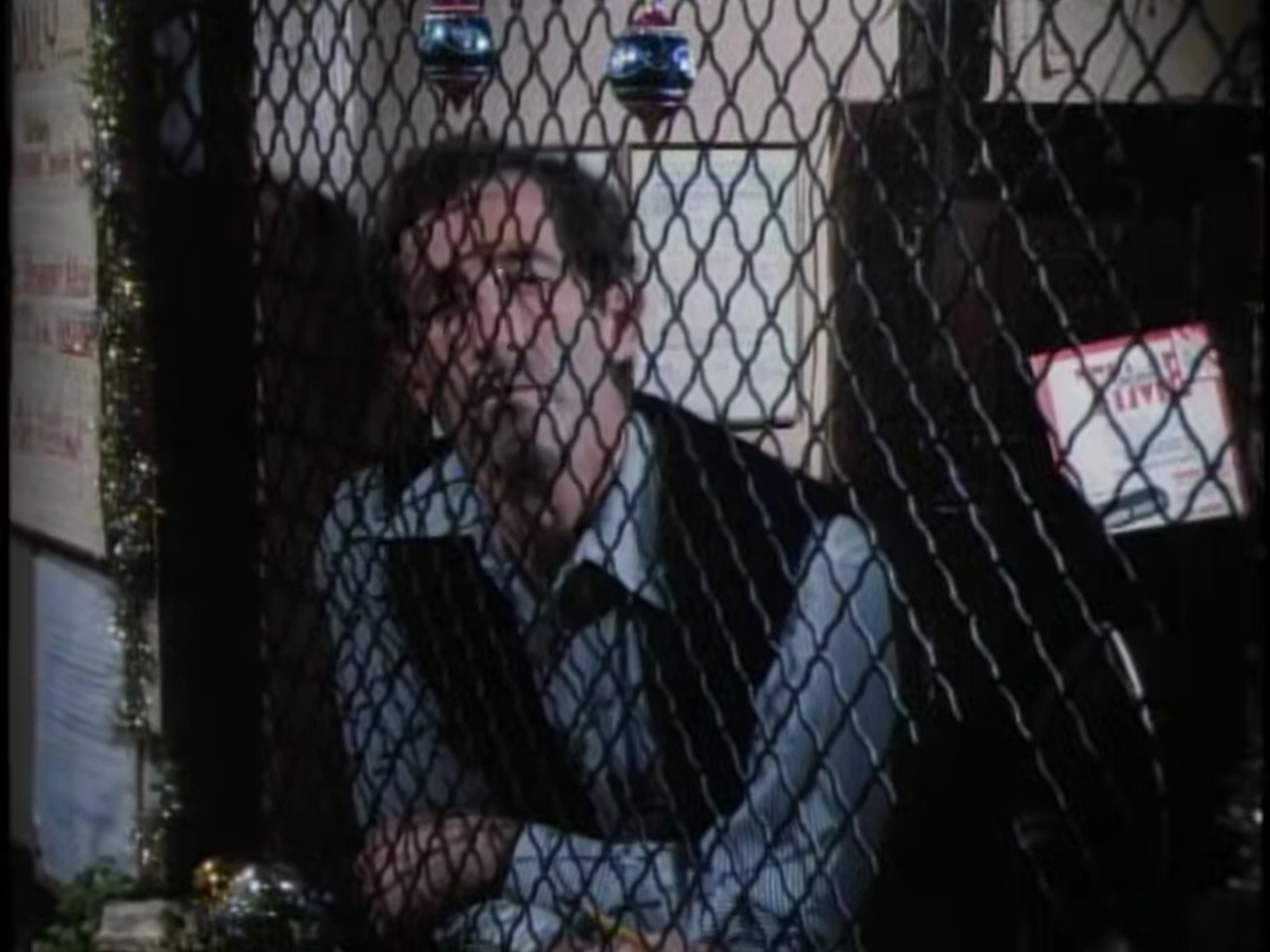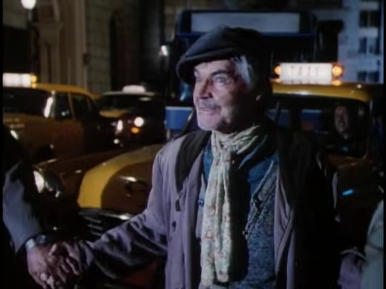 The part feels so off: Basinger is walking past the bums he met over the course of the episode, and yet he completely ignores them. As though they didn’t exist. Most importantly, who are these bums: like, the guy drumming on the wall is the same bum lined up for a bed at the shelter where Basinger took Jonathan and Mark earlier. And he had told Basinger that he was next in line and wouldn’t want to give it up for anything. But now, apparently, he’s there—and somehow he has walked all the way to Basinger’s workplace (even though, mind, Basinger had to move on Barney’s cab for the entire episode). And Basinger pays no attention to him. It’s as though that bum were invisible or something. Maybe he died at some point while waiting and is now a ghost that nobody can see or something. Or maybe he never existed in the first place, and he was just some hallucination. As though this entire episode were just Basinger’s hallucination.