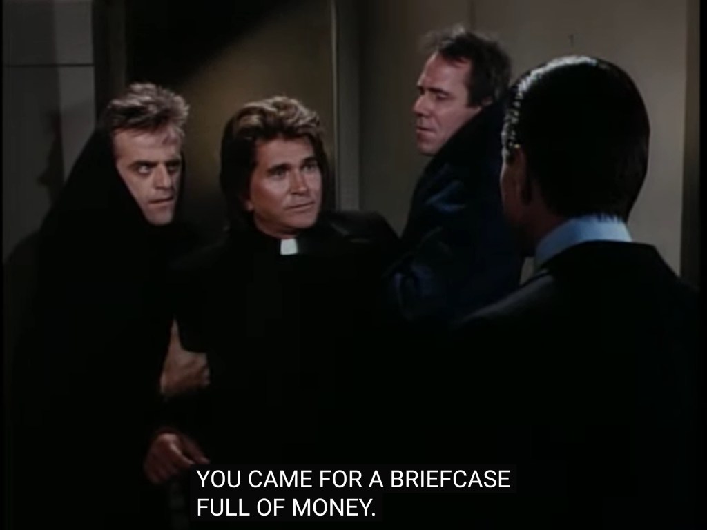 Then, suddenly, a man arrives there as well, pretending to be a priest (just like them, for that matter). But he’s no angel: he’s actually a burglar who stole two mysterious fellas’ briefcase, which is loaded.