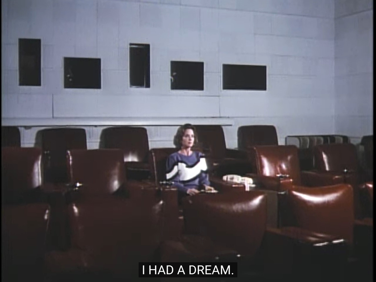 The entire left side of the room is visibly, completely empty, and everyone is sitting on the side at the right of it instead. Perhaps they couldn’t afford to pay enough actors and stand-ins and extras for the scene, so they just moved everyone on the right and tried to conceal that side.