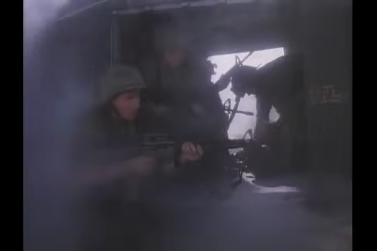 Here, however, the pattern changes. Immediately after the usual opening, instead of displaying the title and actors’ credits, the episode cuts to a Vietnam War sequence, with soldiers firing guns and running across a field (as though it were a cold open).