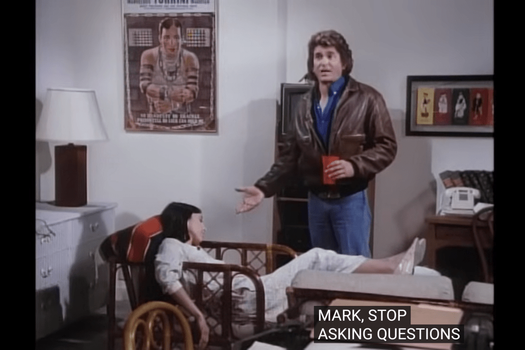 Angel Revelation: at the beginning, Mark asks Jonathan what excuse they will use to approach Belker for the assignment, mentioning all the strategies they have used before (getting the same job as the subject’s using angelic references, moving in next door, pretending to be old friends of friends).