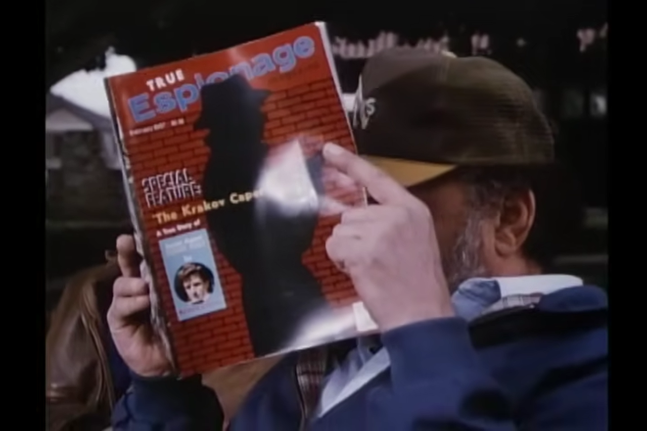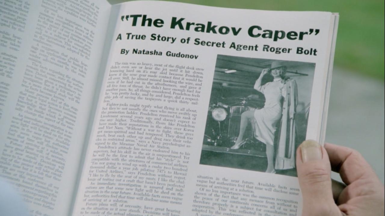Blooper: there are a couple of bloopers in the episode, something the series is used to doing. When Mark is shown reading the spy story “The Krakov Caper” by the bench, the magazine he’s reading actually displays an image of an interview to Pendelton from the Air Navy instead.